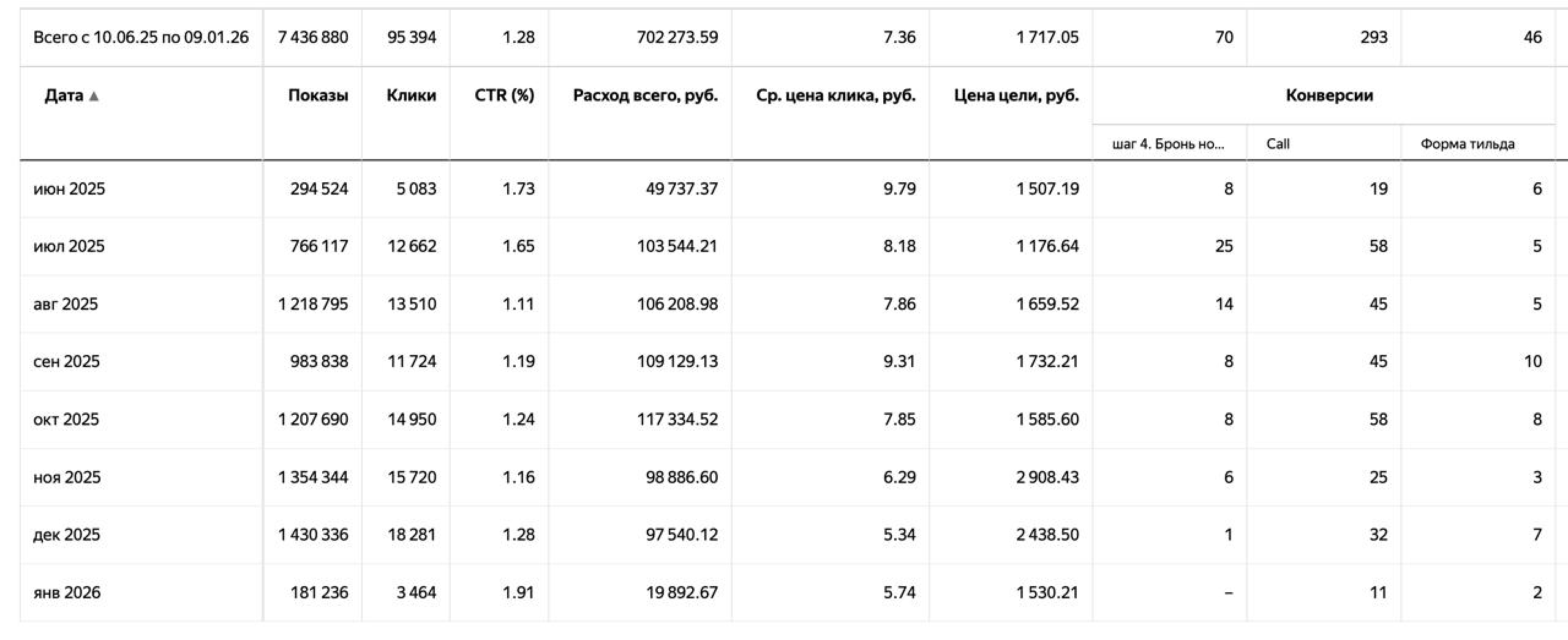 В конце мая 2025 года ко мне обратился руководитель Отеля в Костромской области для выяснения ситуации, что происходит с рекламой. Рекламный канал был единственный - Яндекс Директ. И все надежды тоже были только на него. Но эффективность рекламы с каждой неделей падала, в течение 7 дней броней с рекламы вообще могло не быть